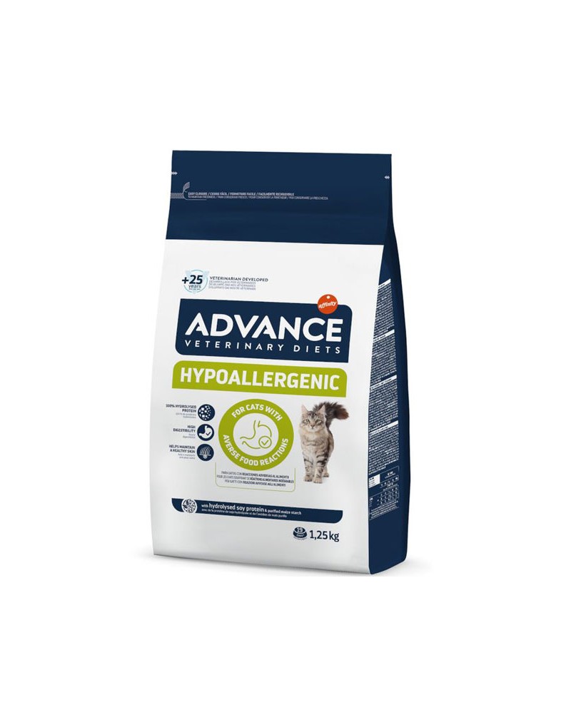 ADVANCE VETERINARY DIETS - Hypoallergenic es un alimento dietético completo para gatos adultos, creado para reducir las intolerancias a ingredientes y nutrientes, formulado con fuentes de proteínas hidrolizadas y fuentes de carbohidratos seleccionadas.
